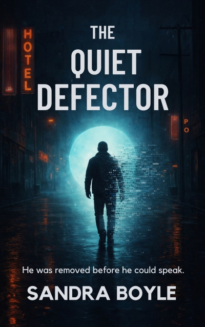 The particles are semi-transparent and vary in size, with some forming faint hints of numbers and broken text strings, barely visible. The effect should feel like a person dissolving into data, but very restrained and elegant.